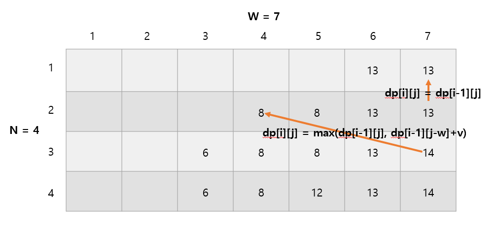 현재 물건을 넣는 경우에는 dp[i][j] = max(dp[i-1][j], dp[i-1][j-w] + v)가 됩니다.