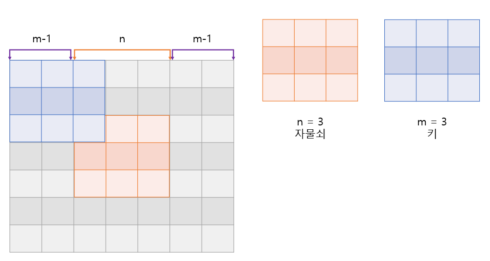 [2를 곱해준 이유는 위, 아래 혹은 좌, 우 각각 (m-1)의 영역 크기가 필요하기 때문입니다.]