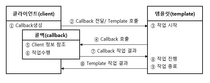 - 템플릿은 작업 흐름을 가진 코드를 재사용한다는 의미에서 붙인 이름이며, 콜백은 템플릿 안에서 호출되는 것을 목적으로 만들어진 오브젝트