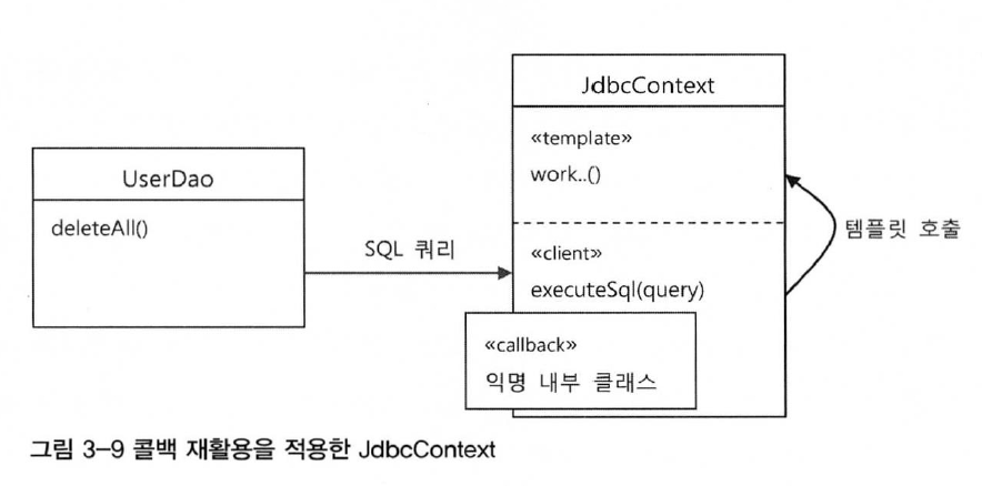 - 클라이언트의 역할은 템플릿 안에서 콜백 오브젝트(펑셔널 오브젝트)를 만들고, 콜백이 참조할 정보 제공. 만들어진 콜백은 클라이언트가 템플릿의 메소드를 호출할 때 파라미터로 전달