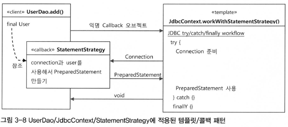 - 템플릿은 정해진 작업 흐름을 따라 작업을 진행하다가 내부에서 생성한 참조정보를 가지고 콜백 오브젝트의 메소드를 호출. 콜백 작업 수행 후 결과를 템플릿에 전달템플릿은 콜백 작업 수행 결과를 사용해 작업을 마저 수행. 최종 결과를 클라이언트에게 전달해 주기도 함