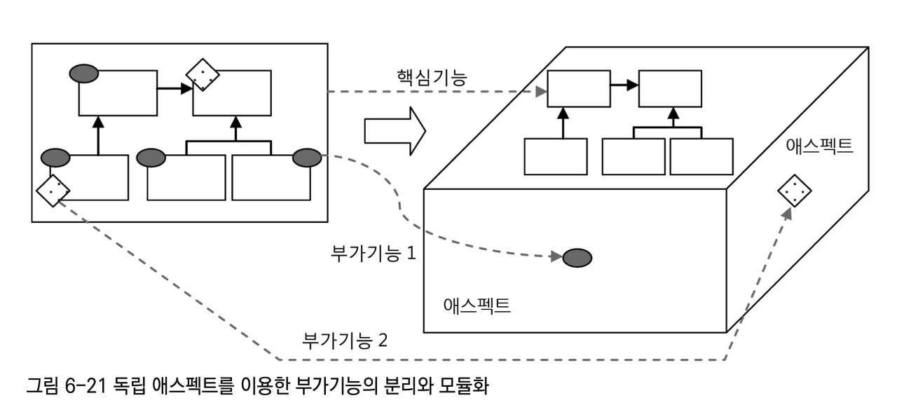 - 여러 다른 측면에 존재하는 부가기능은 결국 핵심기능과 함께 어우러져서 동작함
