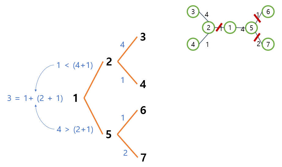 6,7번의 부모인 5를 짜르게 되면 가중치는 4로 3보다 커지게 됩니다.