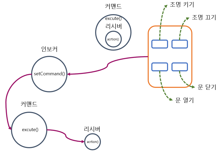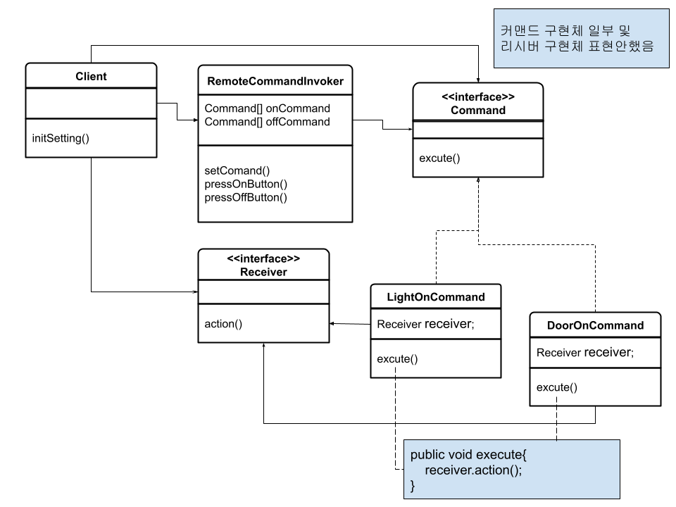 - Command객체 내부에 실질적 동장을 하는 Receiver가 존재한다.
