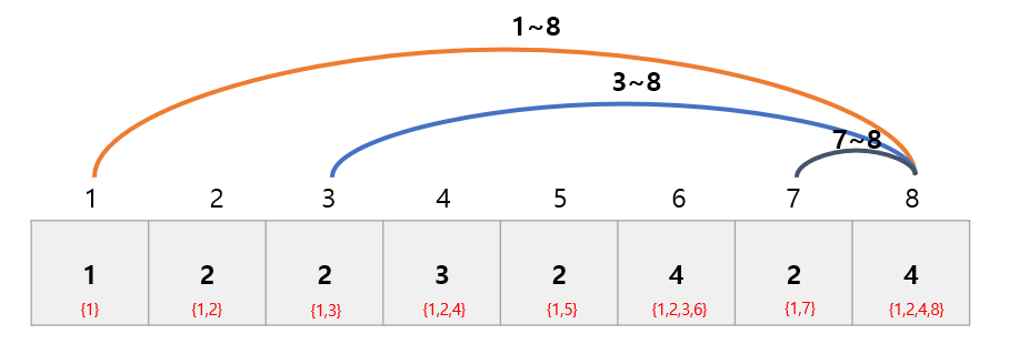 즉, 1~8, 3~8, 7~8 사이의 수에서 약수의 수를 최대로 가지는 수를 구하는 것입니다.