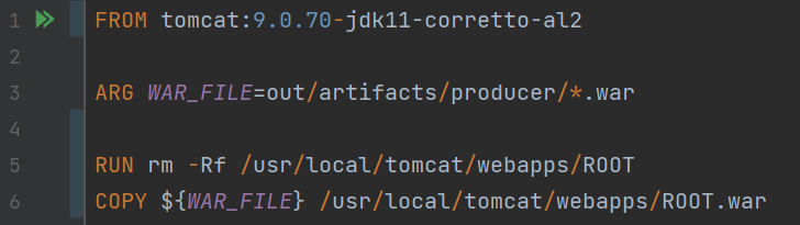 해당 war 파일을 톰켓에서 사용할 수 있도록 다음과 같이 Dockerfile을 작성하면 됩니다.