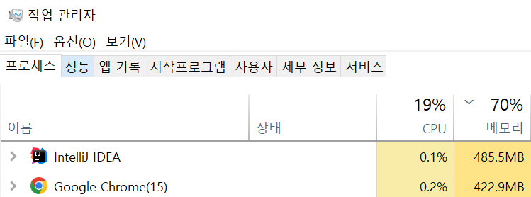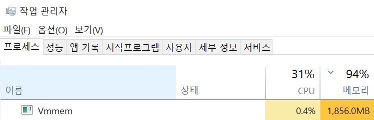 도커를 종료해도 다음 사진과 같이 Vmmem이 남아있어 메모리를 엄청 잡아먹습니다.