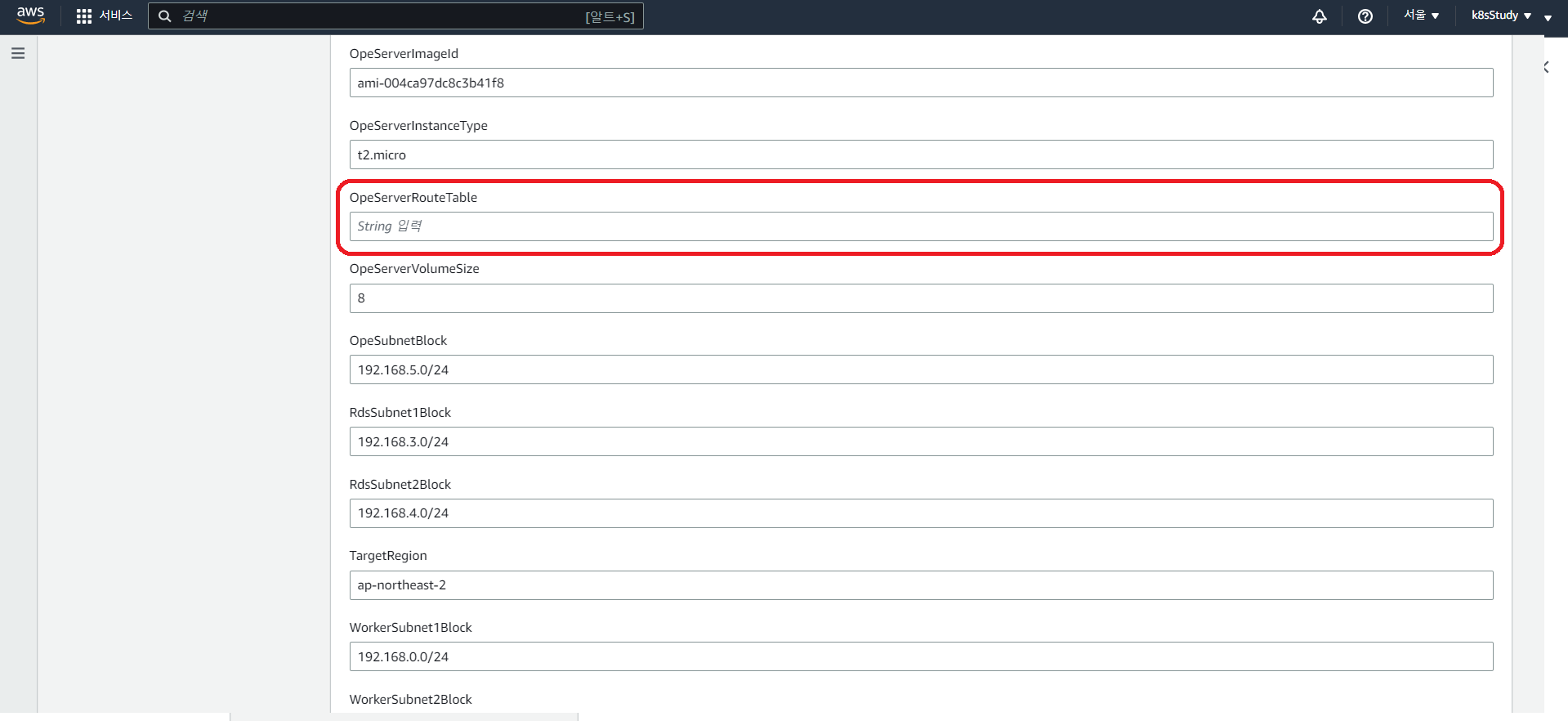 우선 CloudFormation → eks-work-base → 출력 탭에서 RouteTable의 값을 저장한다.