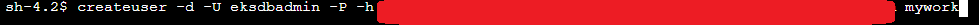 createuser -d -U eksdbadmin -P -h <RDS 엔드포인트 주소> mywork