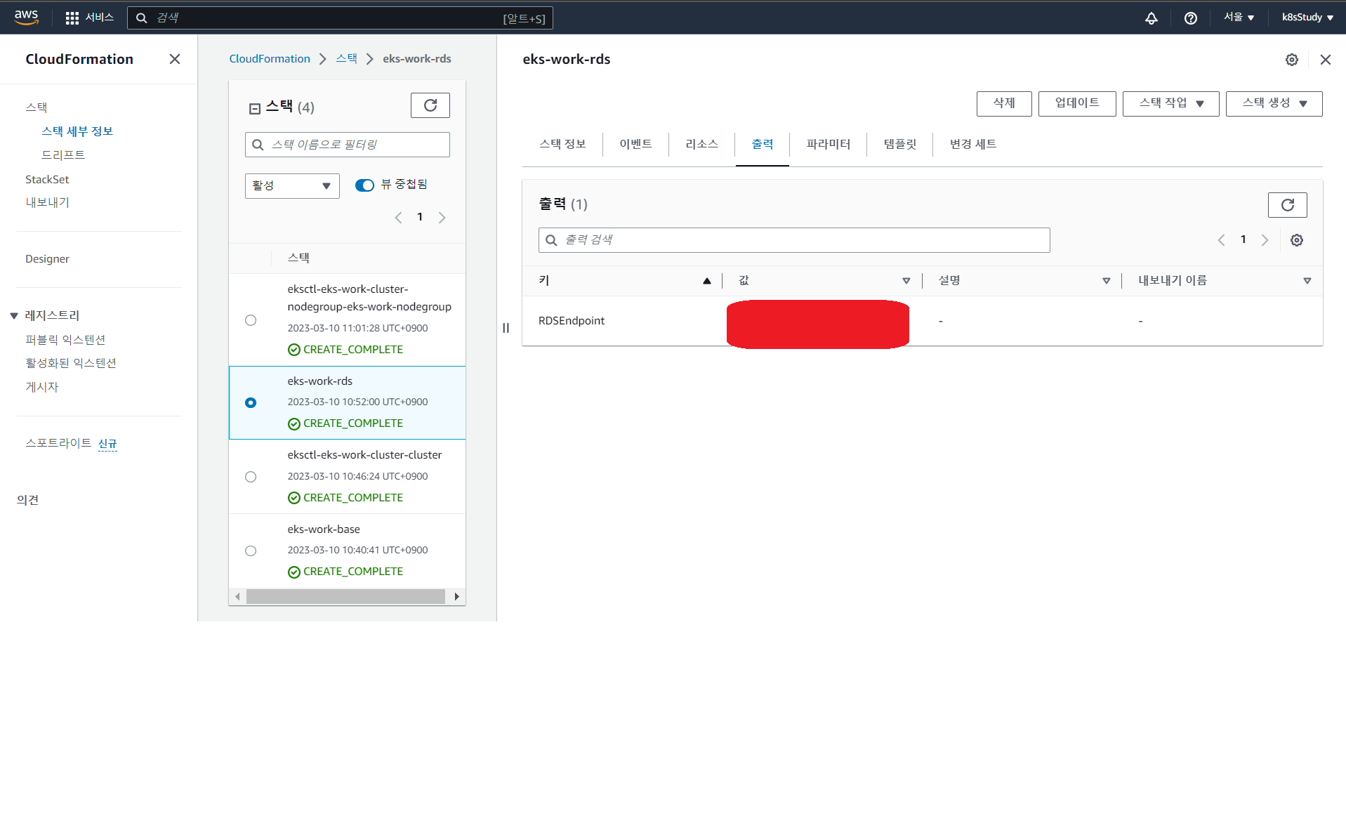 CloudFormation → eks-work-rds 스택 선택 → 출력탭에서 RDSEndpoint키의 값이다.