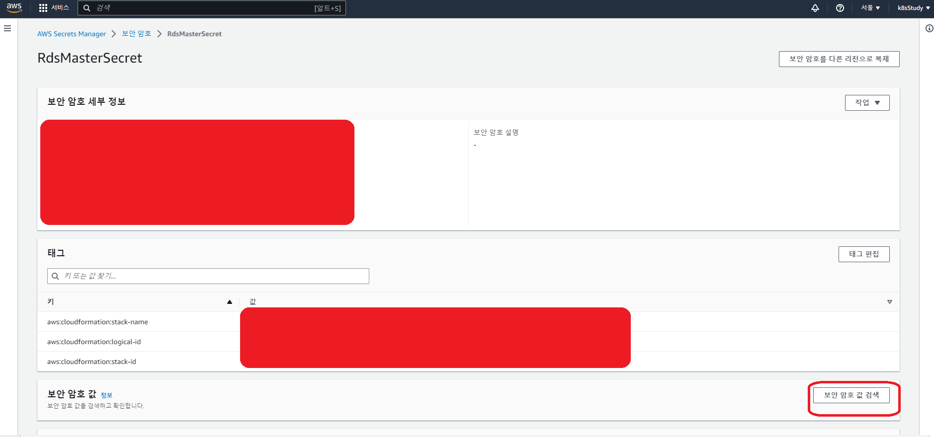 확인 절차는 Secrets Manager → RdsUserSecret → 보안 암호 값 검색 → password 이다.