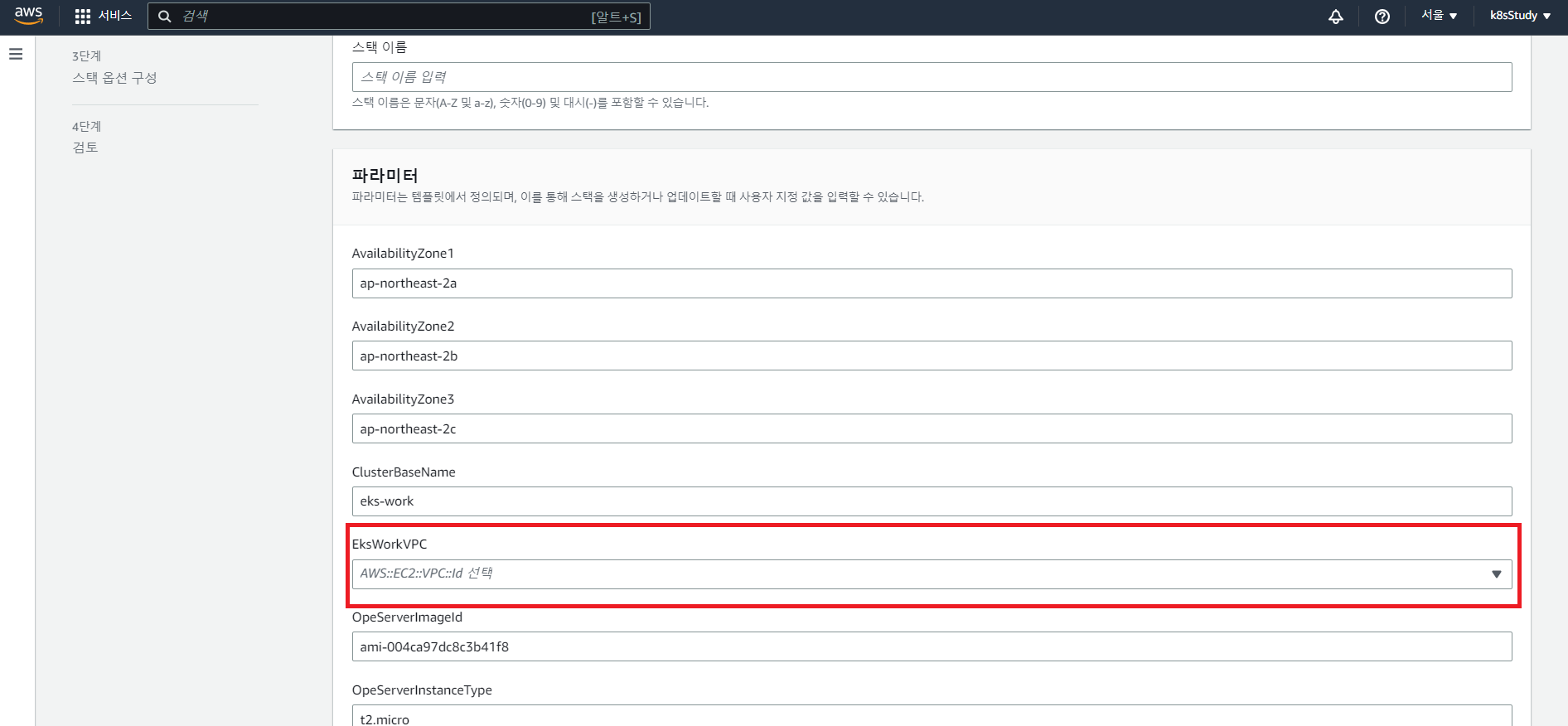 스크롤을 내려 EksWorkVPC에서 이전에 생성한 eks-work-VPC를 선택한다.