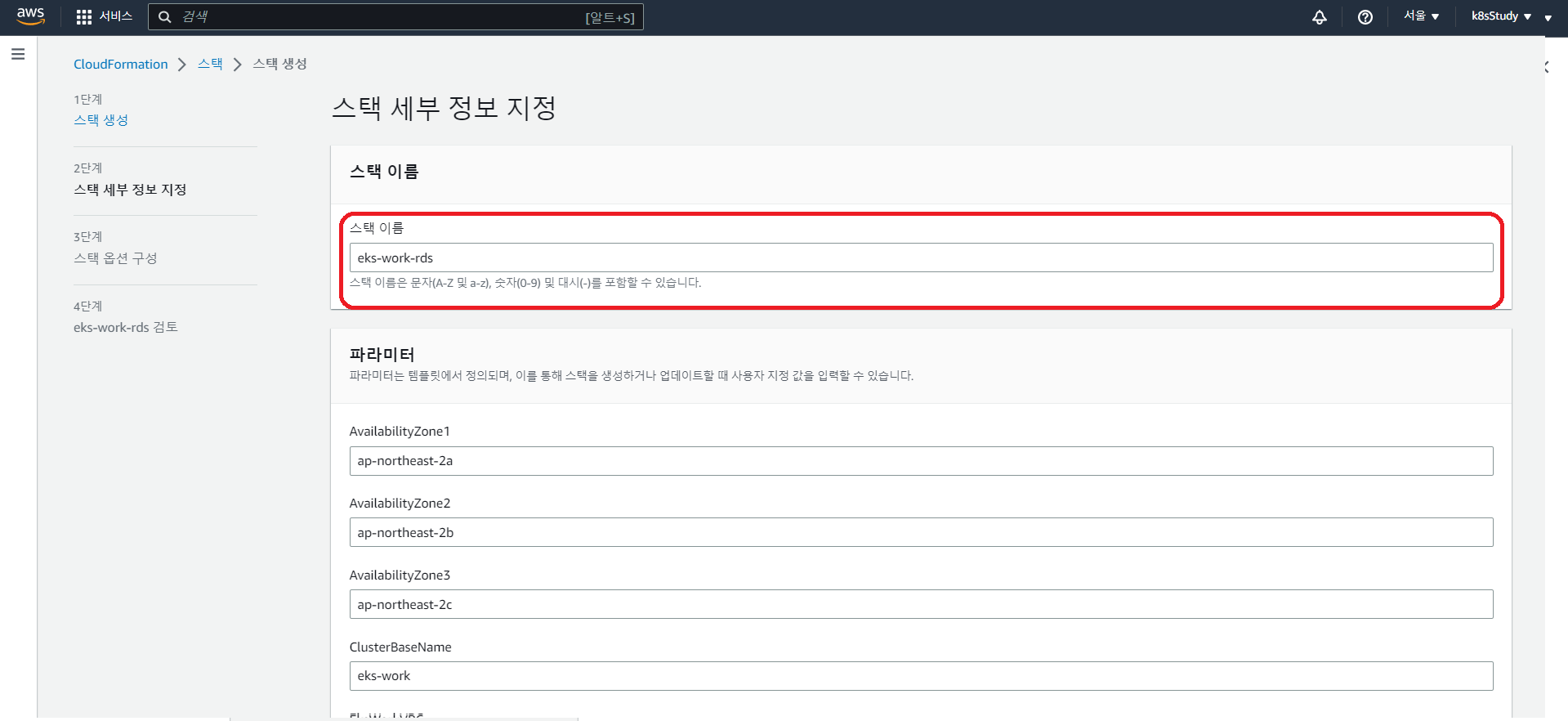 다음을 누르면 아래와 같이 스택 세부 정보 지정이 보인다.
