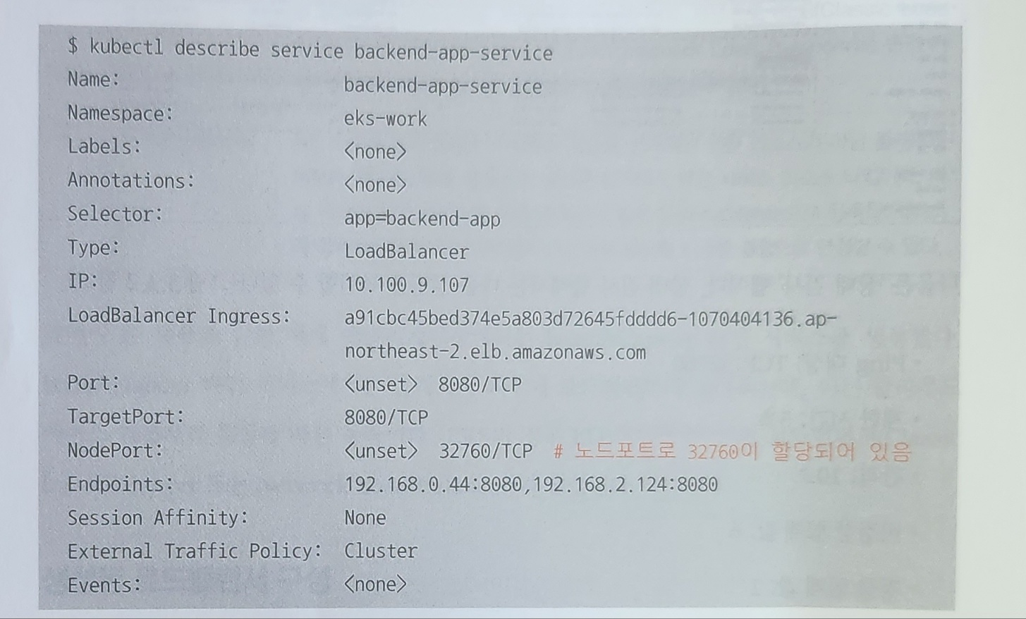 포트 번호 32780은 NodePort 타입의 서비스가 할당된 것이다. 생성된 서비스 타입은 LoadBalancer이지만, NodePort 타입이 할당되는 이유는 로드밸런서가 노드 포트를 각 인스턴스(노드)의 접속 경로로 설정하기 때문이다.