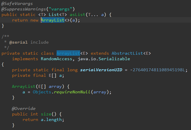 Arrays.asList()는 아래 그림과 같이 내부에 ArrayList를 따로 정의하여 사용하고 있습니다.