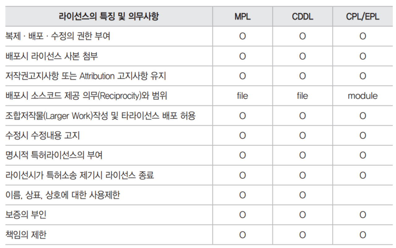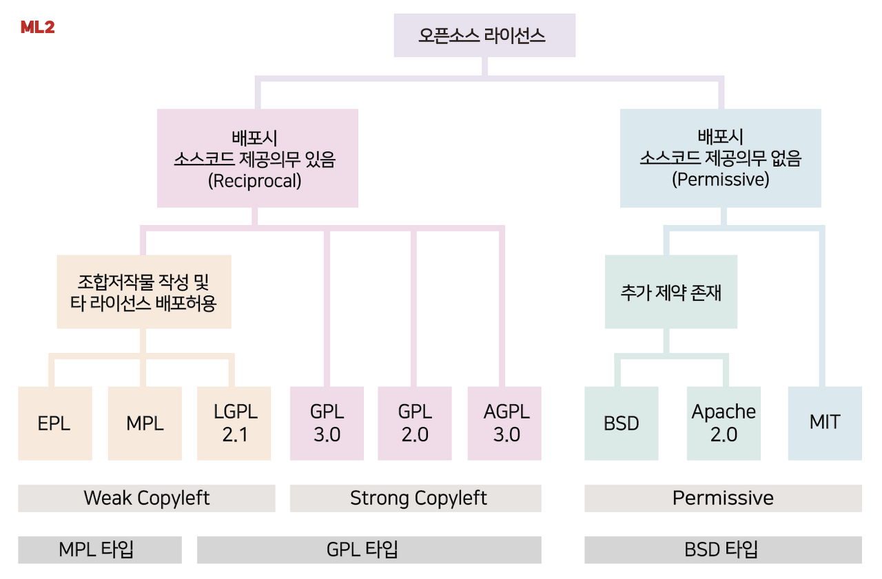 그림처럼 라이선스들을 BSD, GPL, MPL 타입으로 구분할 수 있습니다.