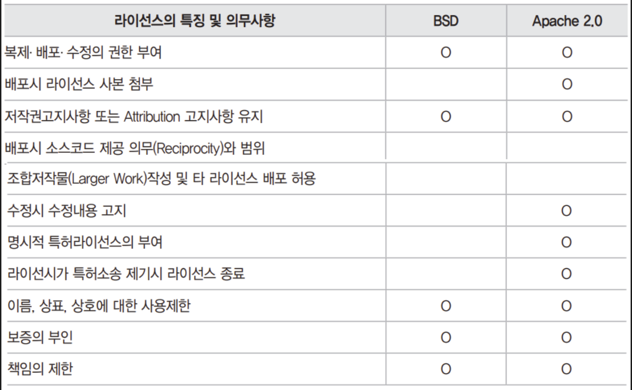 - 예를 들어, BSD와 Apache 2.0 각각의 라이선스를 가지는 코드의 조합이 있습니다.