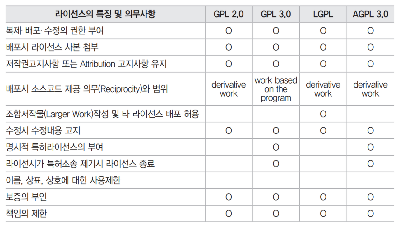 | 무료 | 배포허용 | 소스코드 취득 | 소스코드 수정 | 2차 저작물 재공개 의무 | 독점 SW와 결합 가능 여부 | |
