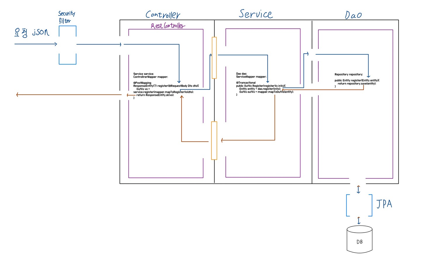 - Service는 전달받은 Vo를 사용하여 계산을 하거나, Dao에 정보를 요청
