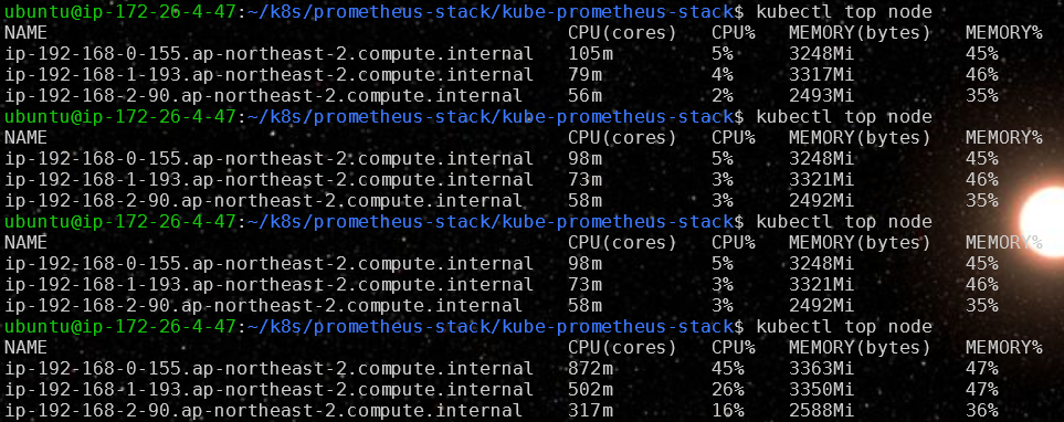 요청과 동시에 쿠버네티스의 노드 상황을 top 명령어로 확인해 봤습니다.