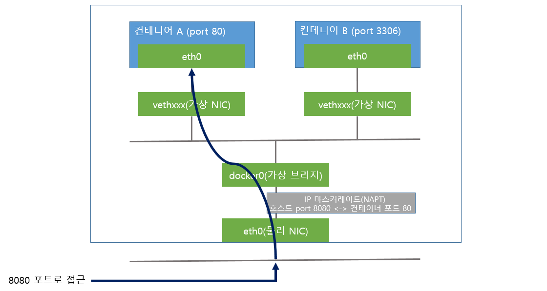 Docker에서 NAPT 기능을 사용할 때는 컨테이너 시작 시 컨테이너 안에서 사용하고 있는 포트를 가상 브리지인 docker0에 대해 개방합니다. 예를 들어 컨테이너 시작 시에 컨테이너 안 웹 서버가 사용하는 80번 포트를 호스트 OS의 8080번 포트로 전송하도록 설정하면, 호스트 OS의 8080번 포트에 액세스시 컨테이너 안의 80 포트로 연결합니다.
