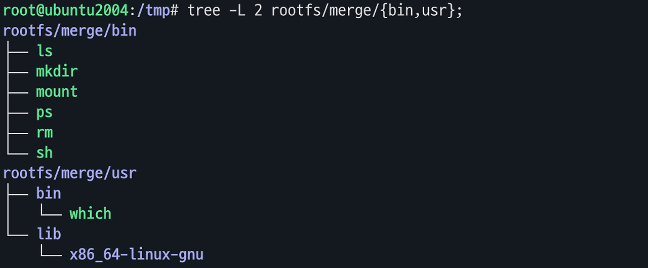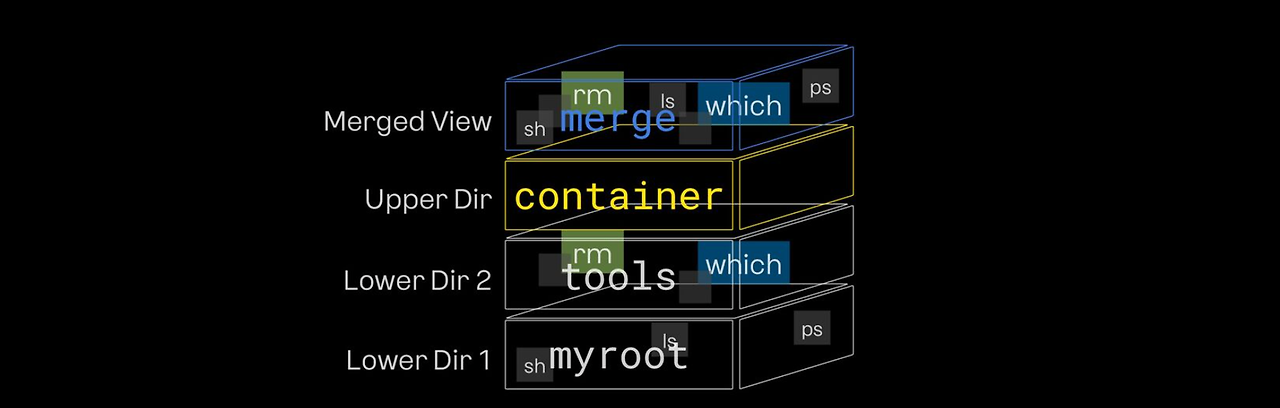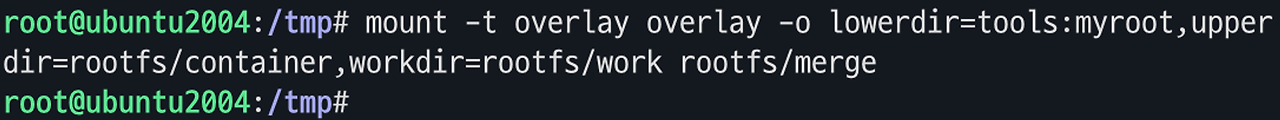 mount -t overlay overlay -o lowerdir=tools:myroot,upperdir=rootfs/container,workdir=rootfs/work rootfs/merge