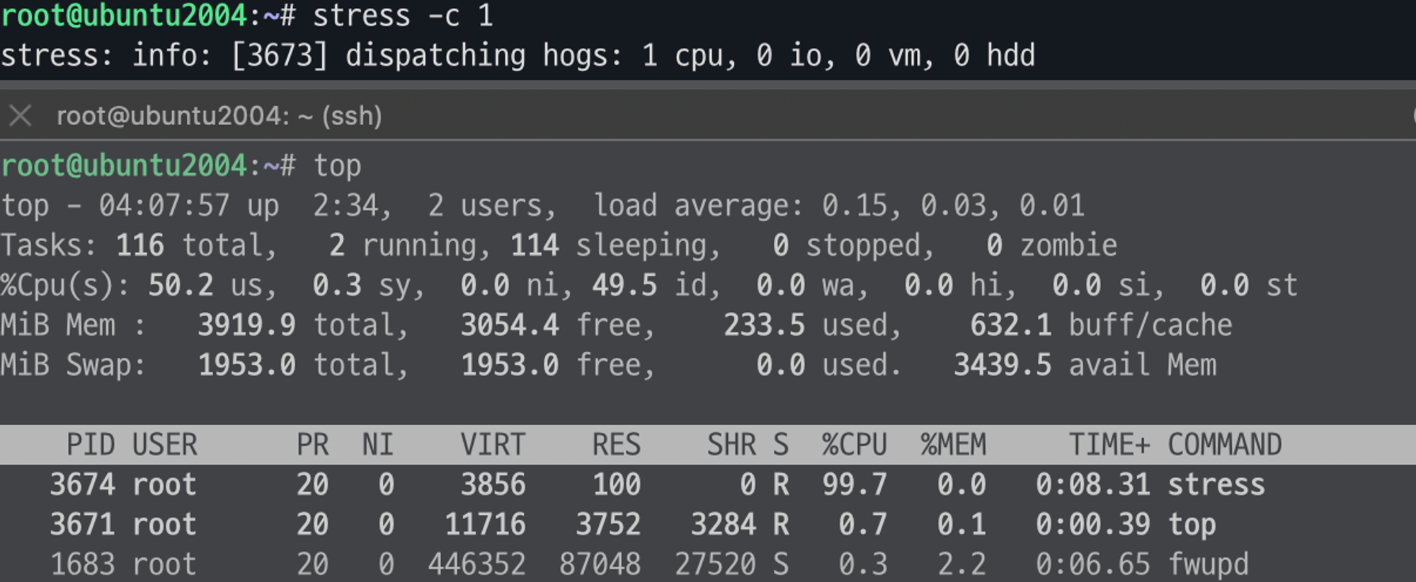 두 개의 터미널을 띄우고, 2번 터미널에 top 명령어를 사용하면 리소스 사용율을 실시간으로 볼 수 있습니다.