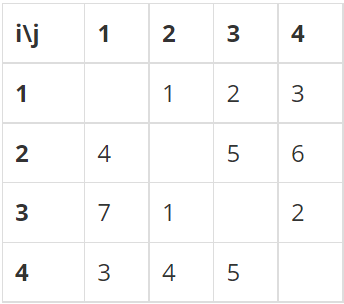 첫째 줄에 N(4 ≤ N ≤ 20)이 주어진다. 둘째 줄부터 N개의 줄에 S가 주어진다. 각 줄은 N개의 수로 이루어져 있고, i번 줄의 j번째 수는 Sij 이다. Sii는 항상 0이고, 나머지 Sij는 1보다 크거나 같고, 100